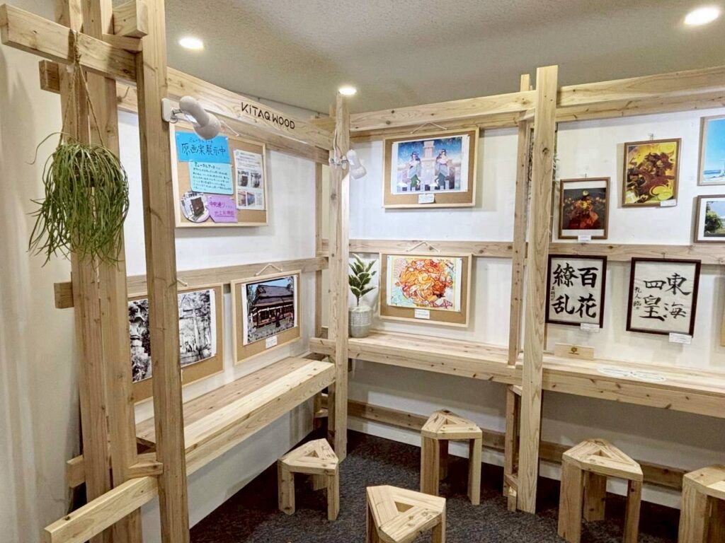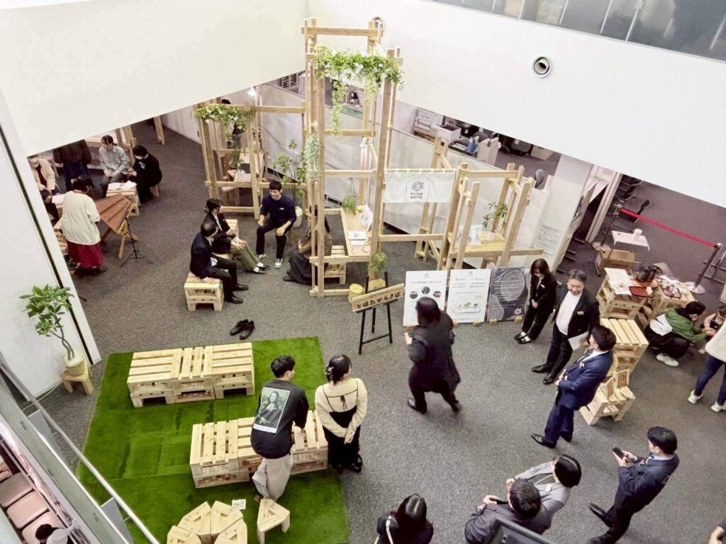 空間では、2×4材(ツーバイフォー材)を用いた展示台や、組み替え可能なパレット式小上がりなど、木材の特徴を活かした大学院生のデザインが形になっています。